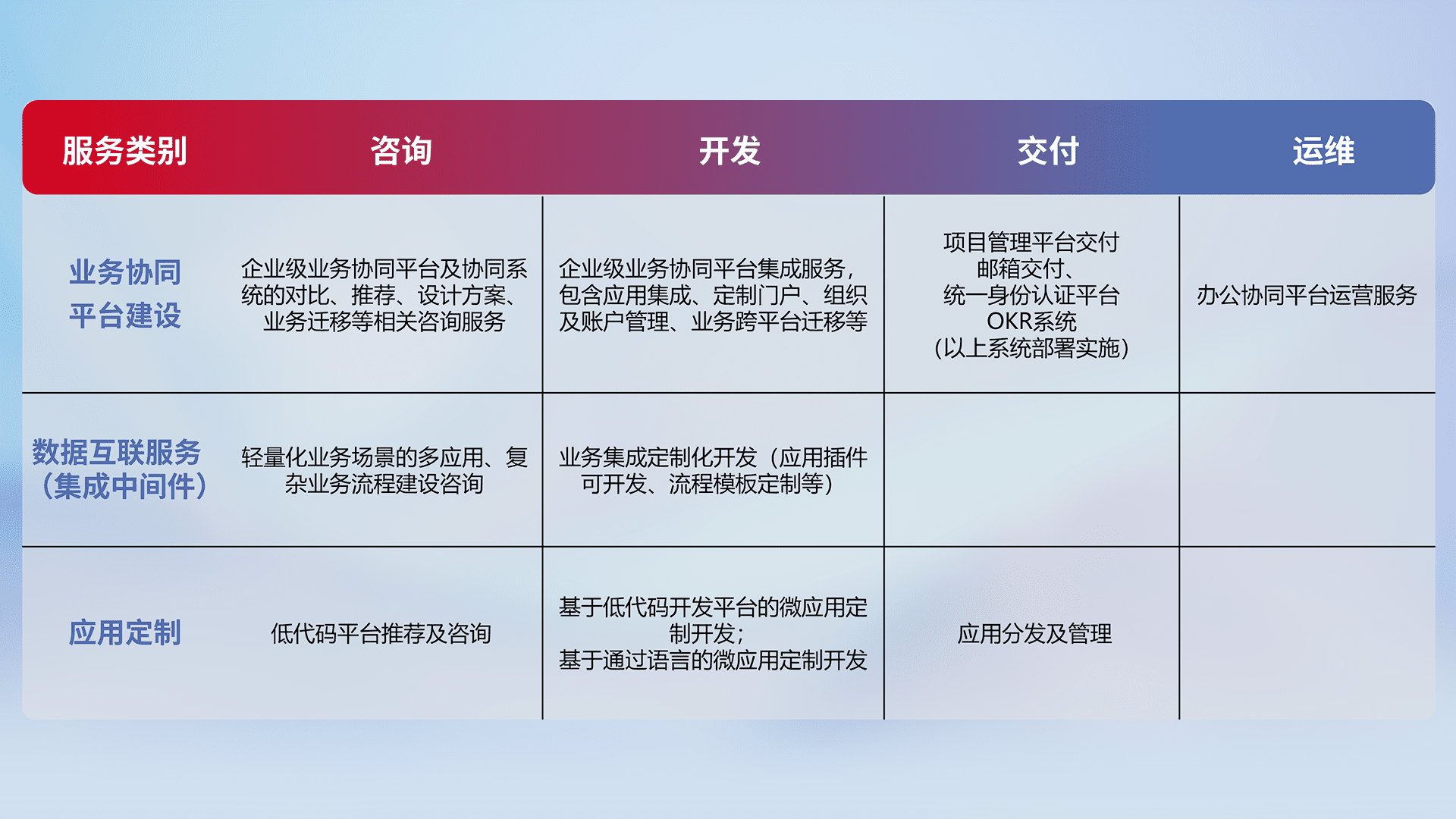 针对钉钉、、企微、、IDaas等平台级产品提供产品的规划、、、方案、、交付、、、、定制化开发等服务,,实现如统一协同办公、、、、智能客户服务、、混合会议管理、、、、智能数据查询、、等业务场景,,实现数字化转型。。。