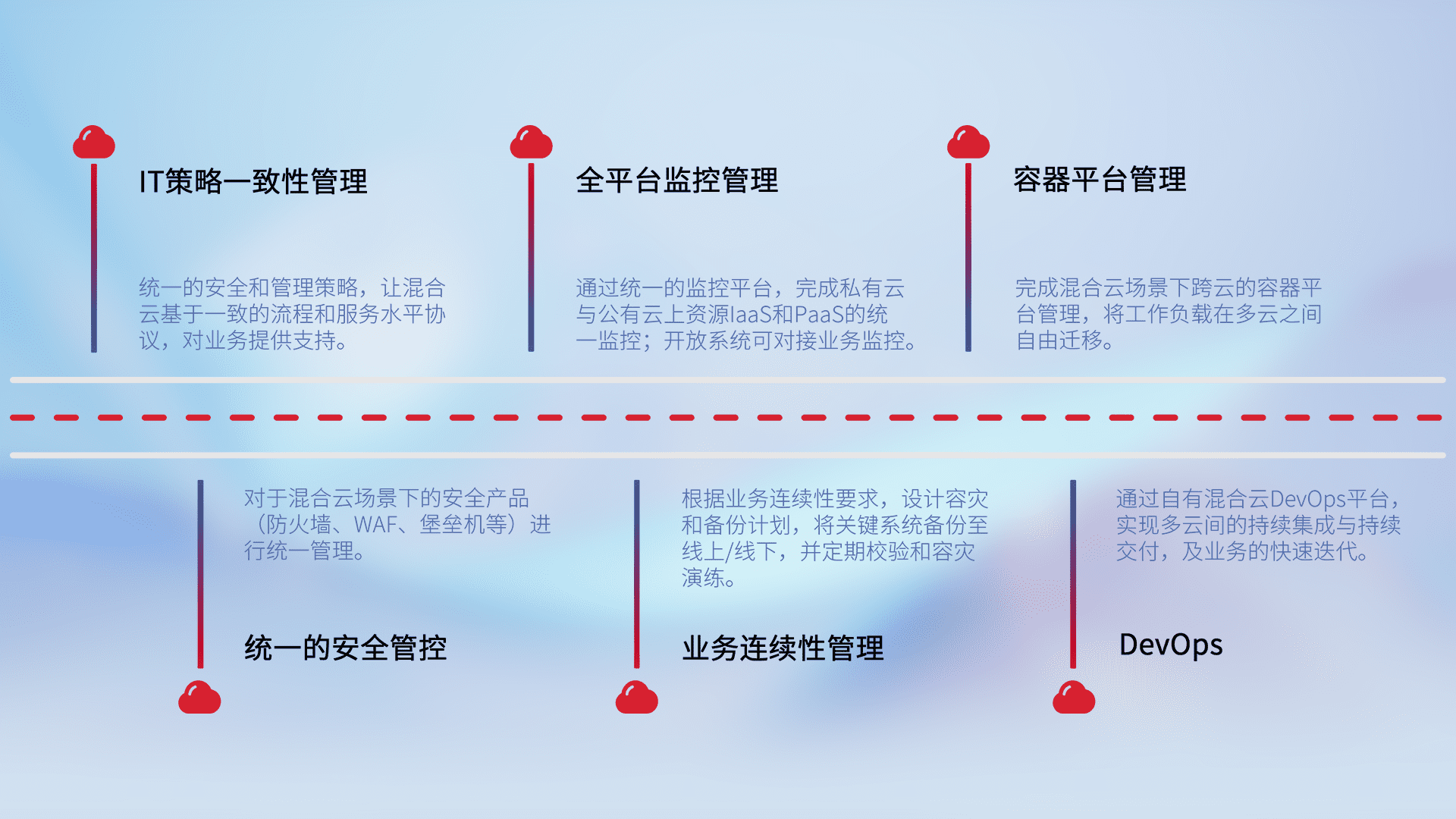 通过多云纳管,,,,以统一的资源数据模型把客户的云资源进行抽象和封装,,进而实现对多云资源的统一操作,,,,保障云资源管理的可靠性、、、稳定性与可用性。。量身定制化运维内容,,,,配置、、开发运维、、补丁管理、、、备份、、、监控、、认证和访问管理、、审计和日常巡检等,,,保障在用云过程中的可靠度,,,,稳定度以及高可用率。。